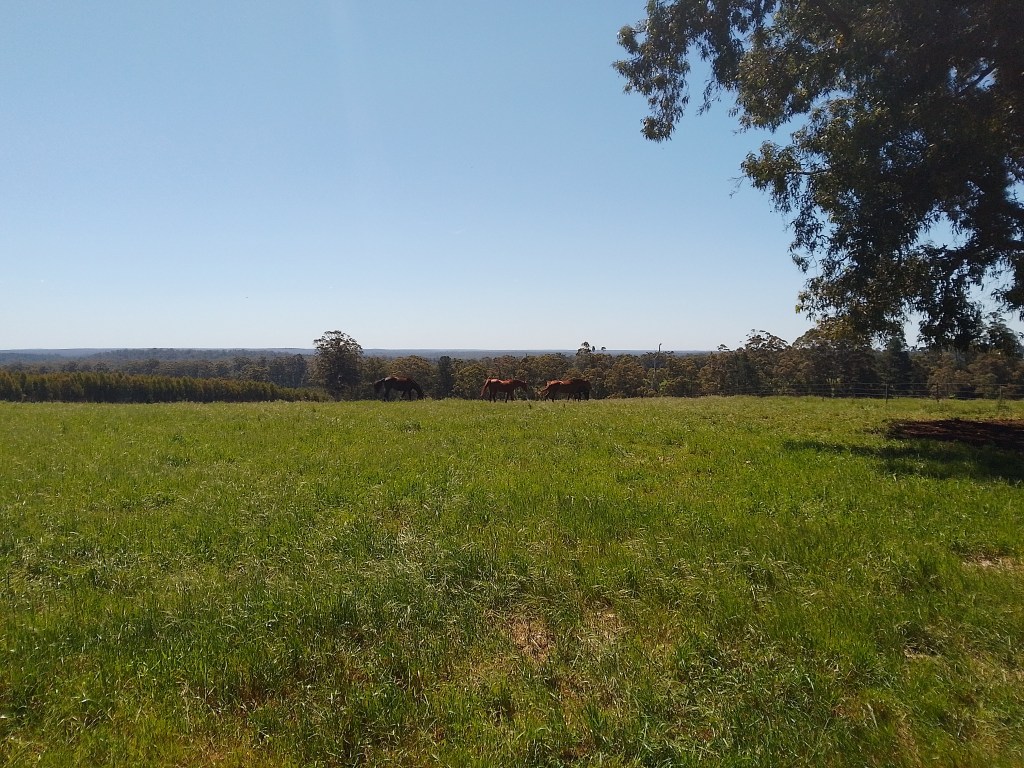 Eventually the height of the trees in the forest got shorter and then gave way to farmland. Dairy farms. Which breed, guess what? Flies. Stop for a moment and you get mugged.